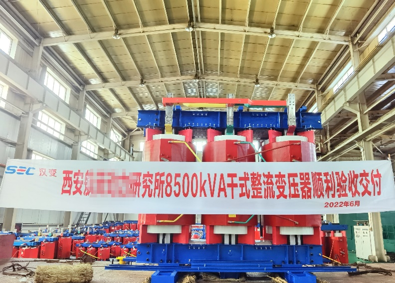 2022年7月1日,新环干变研制生产的8500kVA干式特种整流变压器顺利验收交付。该产品服务于中国航天科技集团公司西安某研究所,在极端工况和特殊环境下对航天材料专用试验设备,提供特种等级电压、电流的专用整流变压器。